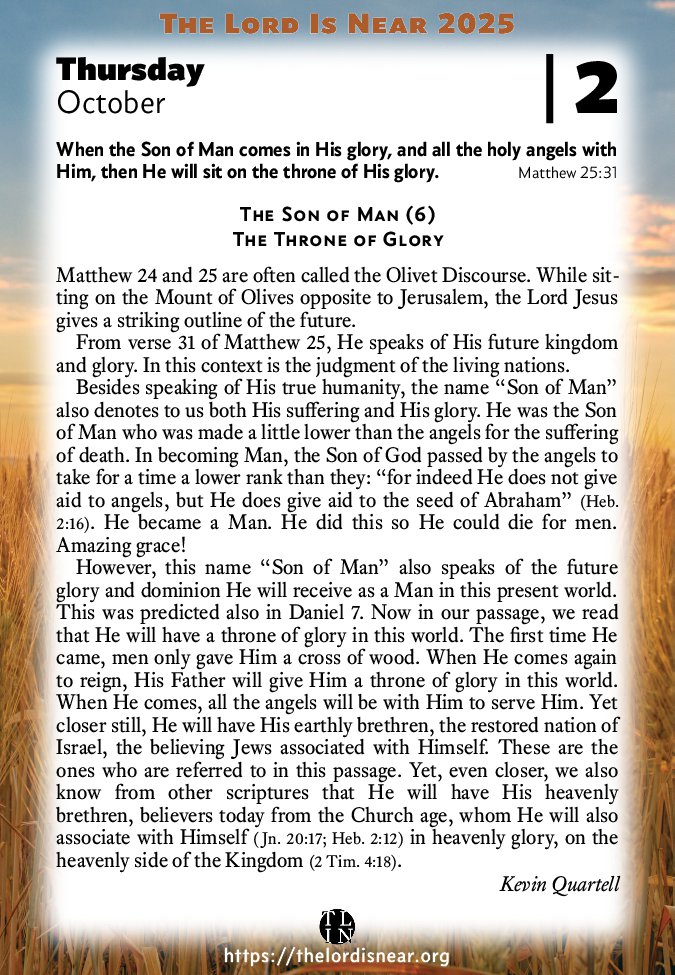 However, this name “Son of Man” also speaks of the future glory and dominion He will receive as a Man in this present world. This was predicted also in Daniel 7. Now in our passage, we read that He will have a throne of glory in this world. The first time He came, men only gave Him a cross of wood. When He comes again to reign, His Father will give Him a throne of glory in this world. When He comes, all the angels will be with Him to serve Him. Yet closer still, He will have His earthly brethren, the restored nation of Israel, the believing Jews associated with Himself. These are the ones who are referred to in this passage. Yet, even closer, we also know from other scriptures that He will have His heavenly brethren, believers today from the Church age, whom He will also associate with Himself (Jn. 20:17; Heb. 2:12) in heavenly glory, on the heavenly side of the Kingdom (2 Tim. 4:18).