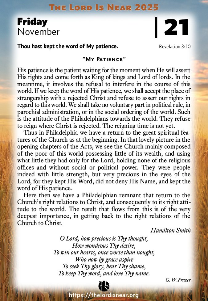 His patience is the patient waiting for the moment when He will assert His rights and come forth as King of kings and Lord of lords. In the meantime, it involves the refusal to interfere in the course of this world. If we keep the word of His patience, we shall accept the place of strangership with a rejected Christ and refuse to assert our rights in regard to this world. We shall take no voluntary part in political rule, in parochial administration, or in the social ordering of the world. Such is the attitude of the Philadelphians towards the world. They refuse to reign where Christ is rejected. The reigning time is not yet.