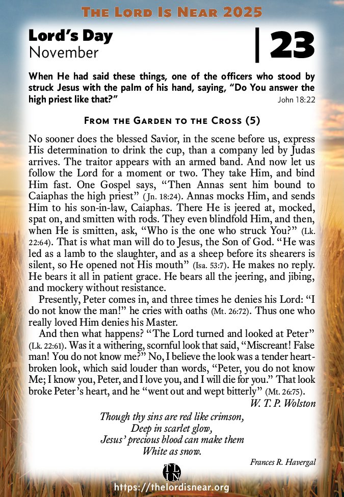 No sooner does the blessed Savior, in the scene before us, express His determination to drink the cup, than a company led by Judas arrives. The traitor appears with an armed band. And now let us follow the Lord for a moment or two. They take Him, and bind Him fast. One Gospel says, “Then Annas sent him bound to Caiaphas the high priest” (Jn. 18:24). Annas mocks Him, and sends Him to his son-in-law, Caiaphas. There He is jeered at, mocked, spat on, and smitten with rods. They even blindfold Him, and then, when He is smitten, ask, “Who is the one who struck You?” (Lk. 22:64). That is what man will do to Jesus, the Son of God. “He was led as a lamb to the slaughter, and as a sheep before its shearers is silent, so He opened not His mouth” (Isa. 53:7). He makes no reply. He bears it all in patient grace. He bears all the jeering, and jibing, and mockery without resistance.