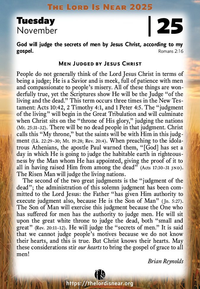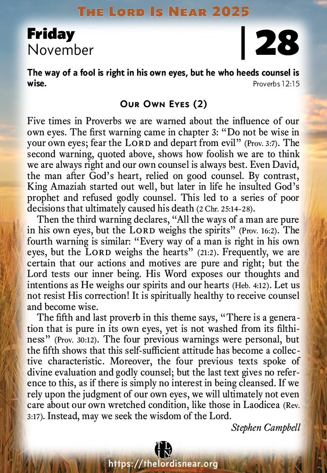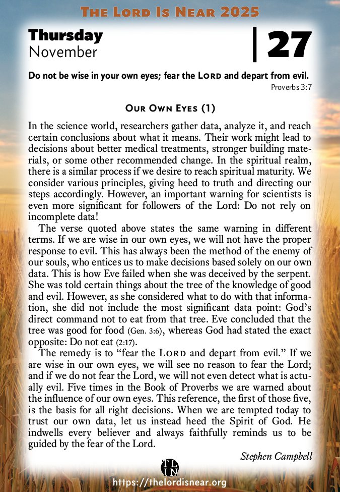 The remedy is to “fear the Lord and depart from evil.” If we are wise in our own eyes, we will see no reason to fear the Lord; and if we do not fear the Lord, we will not even detect what is actually evil. Five times in the Book of Proverbs we are warned about the influence of our own eyes. This reference, the first of those five, is the basis for all right decisions. When we are tempted today to trust our own data, let us instead heed the Spirit of God. He indwells every believer and always faithfully reminds us to be guided by the fear of the Lord.