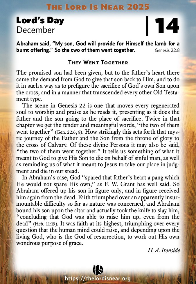 The scene in Genesis 22 is one that moves every regenerated soul to worship and praise as he reads it, presenting as it does the father and the son going to the place of sacrifice. Twice in that chapter we get the tender and meaningful words, “the two of them went together” (Gen. 22:6, 8). How strikingly this sets forth that mystic journey of the Father and the Son from the throne of glory to the cross of Calvary. Of these divine Persons it may also be said, “the two of them went together.” It tells us something of what it meant to God to give His Son to die on behalf of sinful man, as well as reminding us of what it meant to Jesus to take our place in judgment and die in our stead.