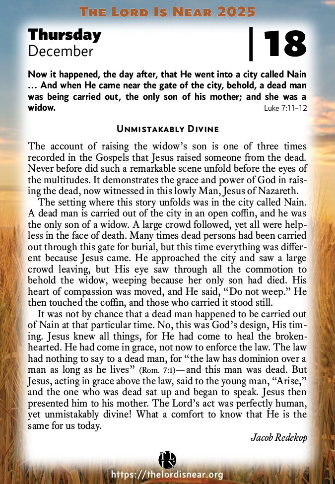 It was not by chance that a dead man happened to be carried out of Nain at that particular time. No, this was God’s design, His timing. Jesus knew all things, for He had come to heal the brokenhearted. He had come in grace, not now to enforce the law. The law had nothing to say to a dead man, for “the law has dominion over a man as long as he lives” (Rom. 7:1)—and this man was dead. But Jesus, acting in grace above the law, said to the young man, “Arise,” and the one who was dead sat up and began to speak. Jesus then presented him to his mother. The Lord’s act was perfectly human, yet unmistakably divine! What a comfort to know that He is the same for us today.