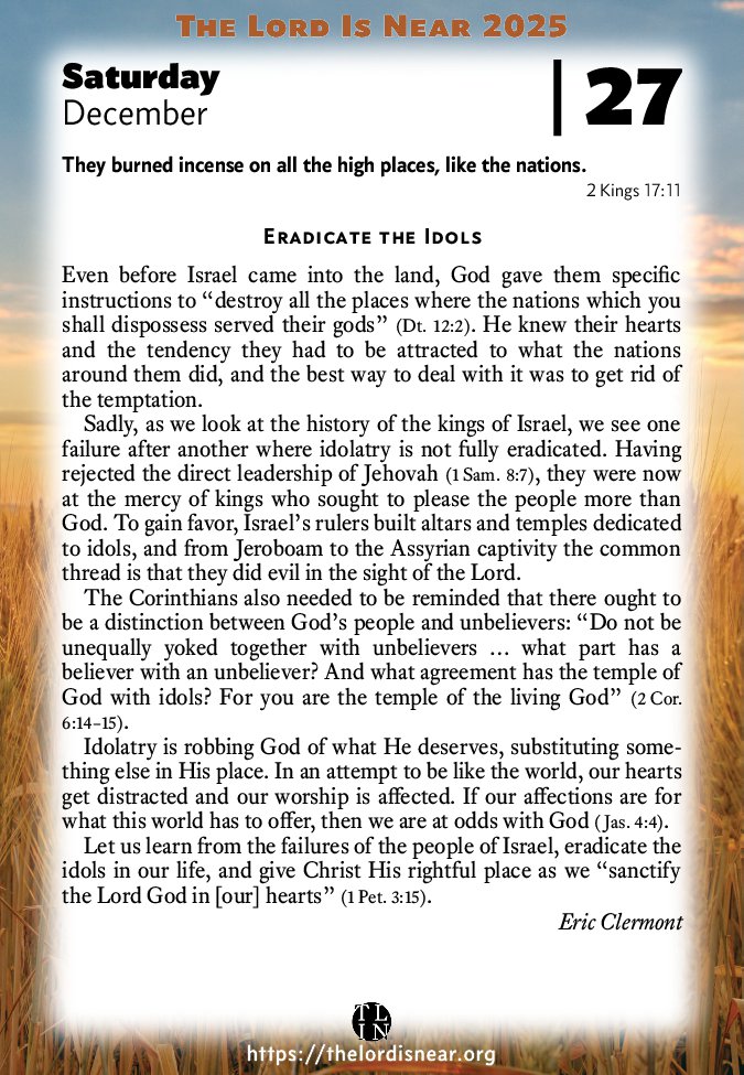 Let us learn from the failures of the people of Israel, eradicate the idols in our life, and give Christ His rightful place as we “sanctify the Lord God in [our] hearts” (1 Pet. 3:15).