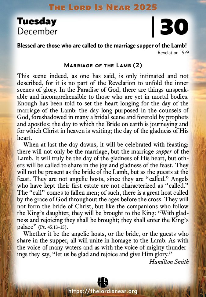 When at last the day dawns, it will be celebrated with feasting: there will not only be the marriage, but the marriage supper of the Lamb. It will truly be the day of the gladness of His heart, but others will be called to share in the joy and gladness of the feast. They will not be present as the bride of the Lamb, but as the guests at the feast. They are not angelic hosts, since they are “called.” Angels who have kept their first estate are not characterized as “called.” The “call” comes to fallen men; of such, there is a great host called by the grace of God throughout the ages before the cross. They will not form the bride of Christ, but like the companions who follow the King’s daughter, they will be brought to the King: “With gladness and rejoicing they shall be brought; they shall enter the King’s palace” (Ps. 45:13–15).