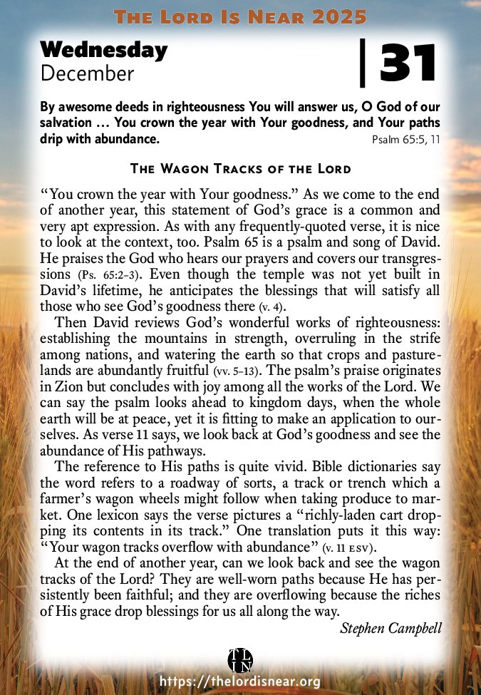 “You crown the year with Your goodness.” As we come to the end of another year, this statement of God’s grace is a common and very apt expression. As with any frequently-quoted verse, it is nice to look at the context, too. Psalm 65 is a psalm and song of David. He praises the God who hears our prayers and covers our transgressions (Ps. 65:2–3). Even though the temple was not yet built in David’s lifetime, he anticipates the blessings that will satisfy all those who see God’s goodness there (v. 4).