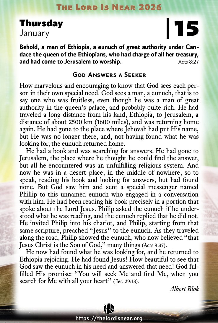 How marvelous and encouraging to know that God sees each person in their own special need. God sees a man, a eunuch, that is to say one who was fruitless, even though he was a man of great authority in the queen’s palace, and probably quite rich. He had traveled a long distance from his land, Ethiopia, to Jerusalem, a distance of about 2500 km (1600 miles), and was returning home again. He had gone to the place where Jehovah had put His name, but He was no longer there, and, not having found what he was looking for, the eunuch returned home.