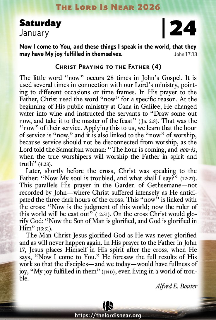 The little word “now” occurs 28 times in John’s Gospel. It is used several times in connection with our Lord’s ministry, pointing to different occasions or time frames. In His prayer to the Father, Christ used the word “now” for a specific reason. At the beginning of His public ministry at Cana in Galilee, He changed water into wine and instructed the servants to “Draw some out now, and take it to the master of the feast” (Jn. 2:8). That was the “now” of their service. Applying this to us, we learn that the hour of service is “now,” and it is also linked to the “now” of worship, because service should not be disconnected from worship, as the Lord told the Samaritan woman: “The hour is coming, and now is, when the true worshipers will worship the Father in spirit and truth” (4:23).