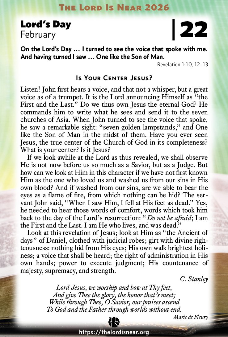 Listen! John first hears a voice, and that not a whisper, but a great voice as of a trumpet. It is the Lord announcing Himself as “the First and the Last.” Do we thus own Jesus the eternal God? He commands him to write what he sees and send it to the seven churches of Asia. When John turned to see the voice that spoke, he saw a remarkable sight: “seven golden lampstands,” and One like the Son of Man in the midst of them. Have you ever seen Jesus, the true center of the Church of God in its completeness? What is your center? Is it Jesus?