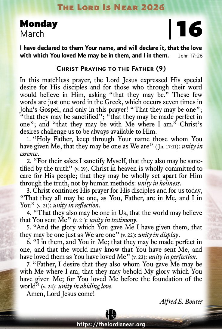 In this matchless prayer, the Lord Jesus expressed His special desire for His disciples and for those who through their word would believe in Him, asking “that they may be.” These few words are just one word in the Greek, which occurs seven times in John’s Gospel, and only in this prayer! “That they may be one”; “that they may be sanctified”; “that they may be made perfect in one”; and “that they may be with Me where I am.” Christ’s desires challenge us to be always available to Him.