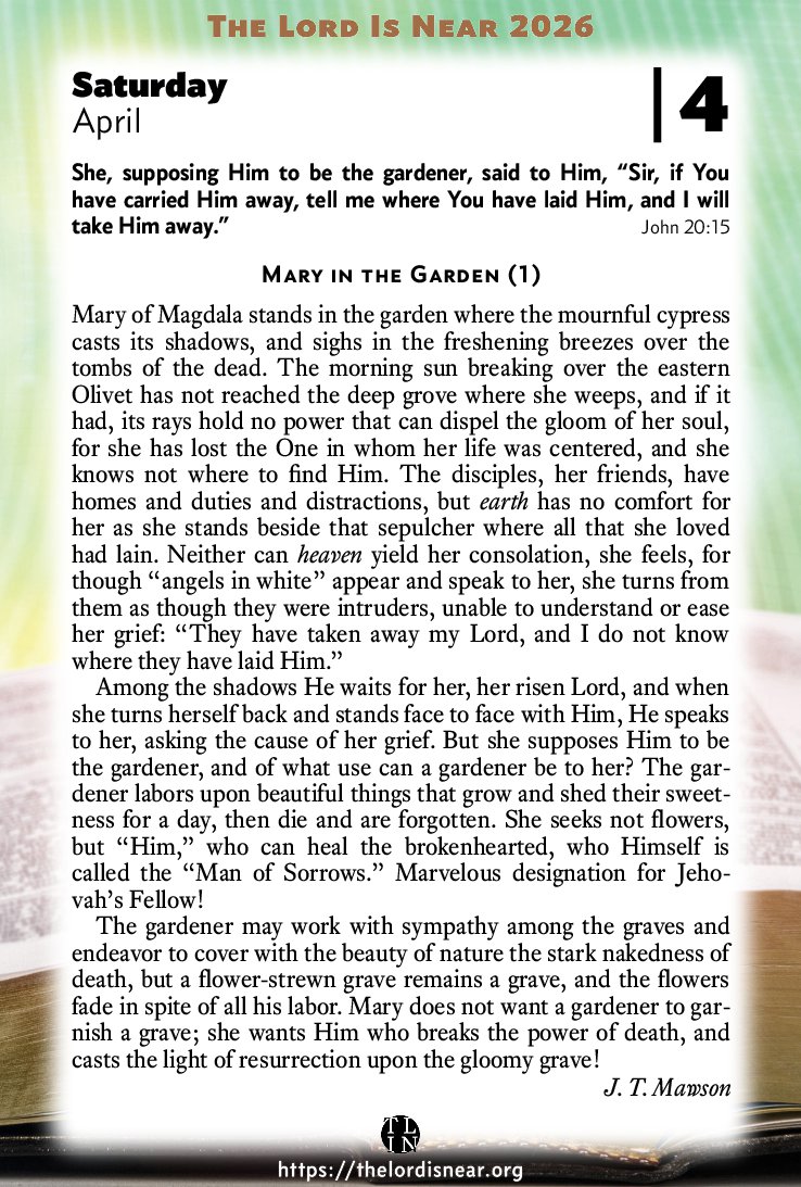 Among the shadows He waits for her, her risen Lord, and when she turns herself back and stands face to face with Him, He speaks to her, asking the cause of her grief. But she supposes Him to be the gardener, and of what use can a gardener be to her? The gardener labors upon beautiful things that grow and shed their sweetness for a day, then die and are forgotten. She seeks not flowers, but “Him,” who can heal the brokenhearted, who Himself is called the “Man of Sorrows.” Marvelous designation for Jehovah’s Fellow!