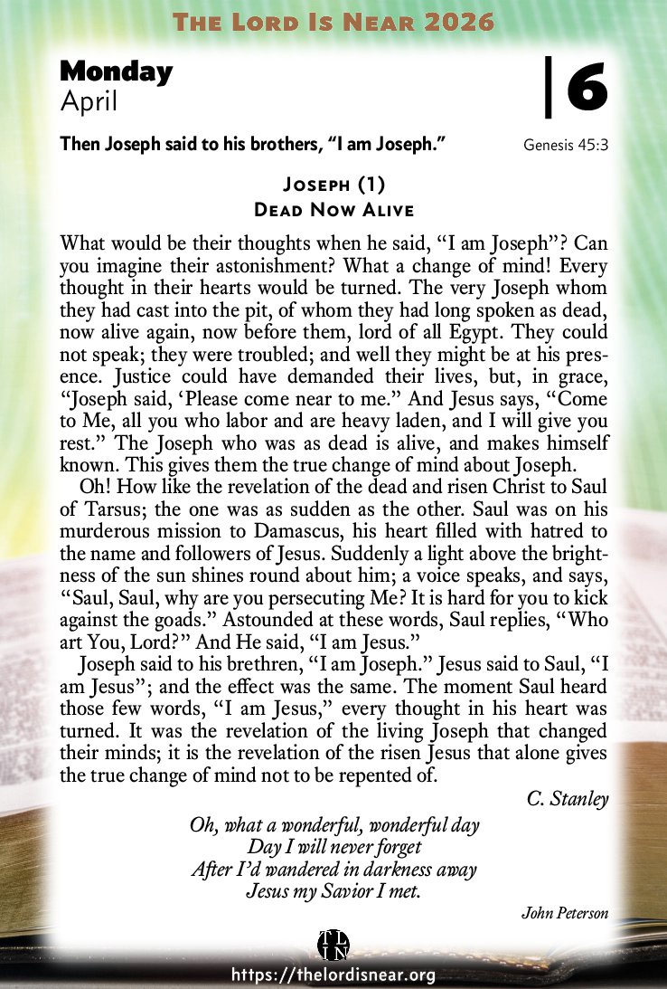 What would be their thoughts when he said, “I am Joseph”? Can you imagine their astonishment? What a change of mind! Every thought in their hearts would be turned. The very Joseph whom they had cast into the pit, of whom they had long spoken as dead, now alive again, now before them, lord of all Egypt. They could not speak; they were troubled; and well they might be at his presence. Justice could have demanded their lives, but, in grace, “Joseph said, ‘Please come near to me.” And Jesus says, “Come to Me, all you who labor and are heavy laden, and I will give you rest.” The Joseph who was as dead is alive, and makes himself known. This gives them the true change of mind about Joseph.