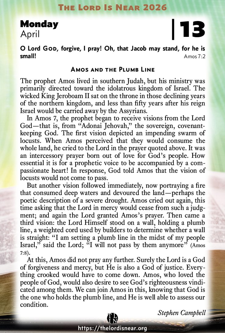 At this, Amos did not pray any further. Surely the Lord is a God of forgiveness and mercy, but He is also a God of justice. Everything crooked would have to come down. Amos, who loved the people of God, would also desire to see God’s righteousness vindicated among them. We can join Amos in this, knowing that God is the one who holds the plumb line, and He is well able to assess our condition.
