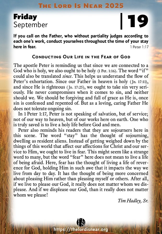 If you call on the Father, who without partiality judges according to each one’s work, conduct yourselves throughout the time of your stay here in fear. 1 Peter 1:17 NKJV