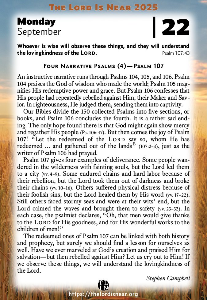 The redeemed ones of Psalm 107 can be linked with both history and prophecy, but surely we should find a lesson for ourselves as well. Have we ever marveled at God’s creation and praised Him for salvation—but then rebelled against Him? Let us cry out to Him! If we observe these things, we will understand the lovingkindness of the Lord.