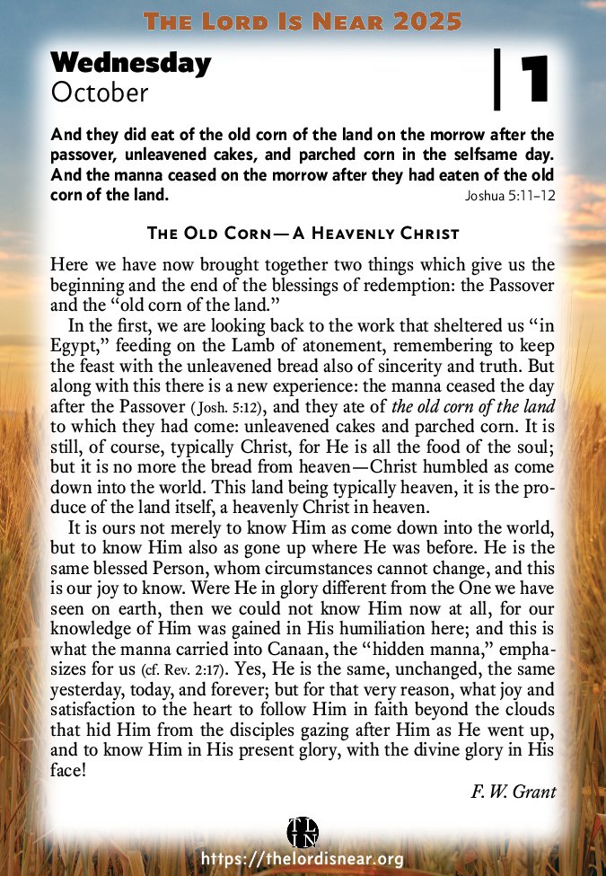 In the first, we are looking back to the work that sheltered us “in Egypt,” feeding on the Lamb of atonement, remembering to keep the feast with the unleavened bread also of sincerity and truth. But along with this there is a new experience: the manna ceased the day after the Passover (Josh. 5:12), and they ate of the old corn of the land to which they had come: unleavened cakes and parched corn. It is still, of course, typically Christ, for He is all the food of the soul; but it is no more the bread from heaven—Christ humbled as come down into the world. This land being typically heaven, it is the produce of the land itself, a heavenly Christ in heaven.
