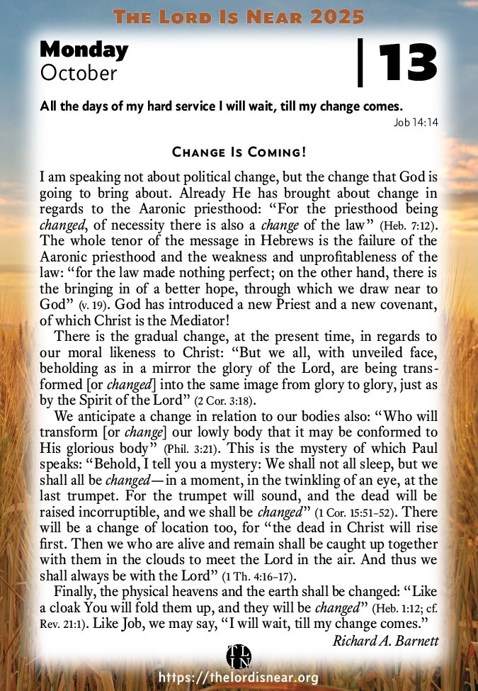 I am speaking not about political change, but the change that God is going to bring about. Already He has brought about change in regards to the Aaronic priesthood: “For the priesthood being changed, of necessity there is also a change of the law” (Heb. 7:12). The whole tenor of the message in Hebrews is the failure of the Aaronic priesthood and the weakness and unprofitableness of the law: “for the law made nothing perfect; on the other hand, there is the bringing in of a better hope, through which we draw near to God” (v. 19). God has introduced a new Priest and a new covenant, of which Christ is the Mediator!
