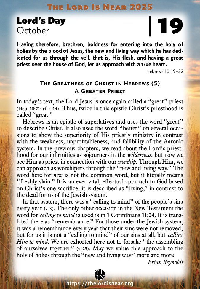 In that system, there was a “calling to mind” of the people’s sins every year (v. 3). The only other occasion in the New Testament the word for calling to mind is used is in 1 Corinthians 11:24. It is translated there as “remembrance.” For those under the Jewish system, it was a remembrance every year that their sins were not removed; but for us it is not a “calling to mind” of our sins at all, but calling Him to mind. We are exhorted here not to forsake “the assembling of ourselves together” (v. 25). May we value this approach to the holy of holies through the “new and living way” more and more!