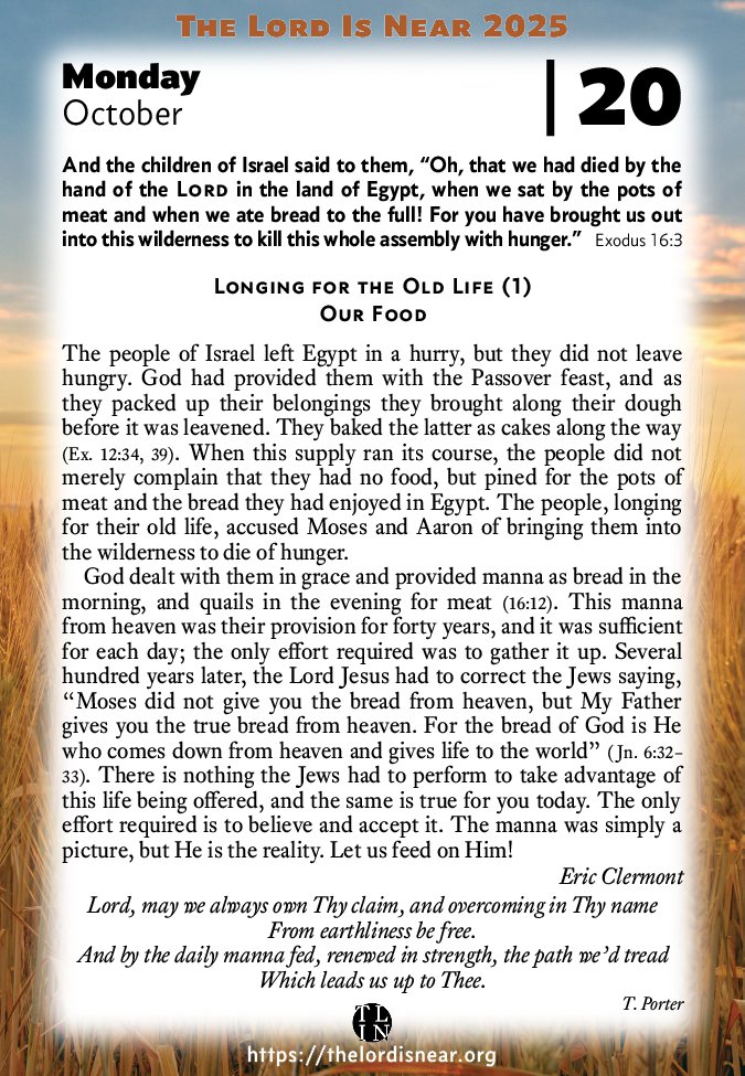 God dealt with them in grace and provided manna as bread in the morning, and quails in the evening for meat (16:12). This manna from heaven was their provision for forty years, and it was sufficient for each day; the only effort required was to gather it up. Several hundred years later, the Lord Jesus had to correct the Jews saying, “Moses did not give you the bread from heaven, but My Father gives you the true bread from heaven. For the bread of God is He who comes down from heaven and gives life to the world” (Jn. 6:32–33). There is nothing the Jews had to perform to take advantage of this life being offered, and the same is true for you today. The only effort required is to believe and accept it. The manna was simply a picture, but He is the reality. Let us feed on Him!