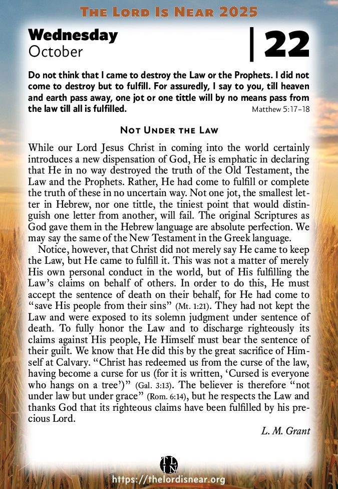 Notice, however, that Christ did not merely say He came to keep the Law, but He came to fulfill it. This was not a matter of merely His own personal conduct in the world, but of His fulfilling the Law’s claims on behalf of others. In order to do this, He must accept the sentence of death on their behalf, for He had come to “save His people from their sins” (Mt. 1:21). They had not kept the Law and were exposed to its solemn judgment under sentence of death. To fully honor the Law and to discharge righteously its claims against His people, He Himself must bear the sentence of their guilt. We know that He did this by the great sacrifice of Himself at Calvary. “Christ has redeemed us from the curse of the law, having become a curse for us (for it is written, ‘Cursed is everyone who hangs on a tree’)” (Gal. 3:13). The believer is therefore “not under law but under grace” (Rom. 6:14), but he respects the Law and thanks God that its righteous claims have been fulfilled by his precious Lord.