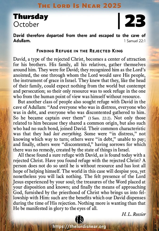 All these found a sure refuge with David, as is found today with a rejected Christ. Have you found refuge with the rejected Christ? A person does not do so until he is without resource and has lost all hope of helping himself. The world in this case will despise you, yet nonetheless you will lack nothing. The felt presence of the Lord Jesus experienced by your soul; the treasures of the Word placed at your disposition and known; and finally the means of approaching God, furnished by the priesthood of Christ who brings us into fellowship with Him: such are the benefits which our David dispenses during the time of His rejection. Nothing more is wanting than that He be manifested in glory to the eyes of all.