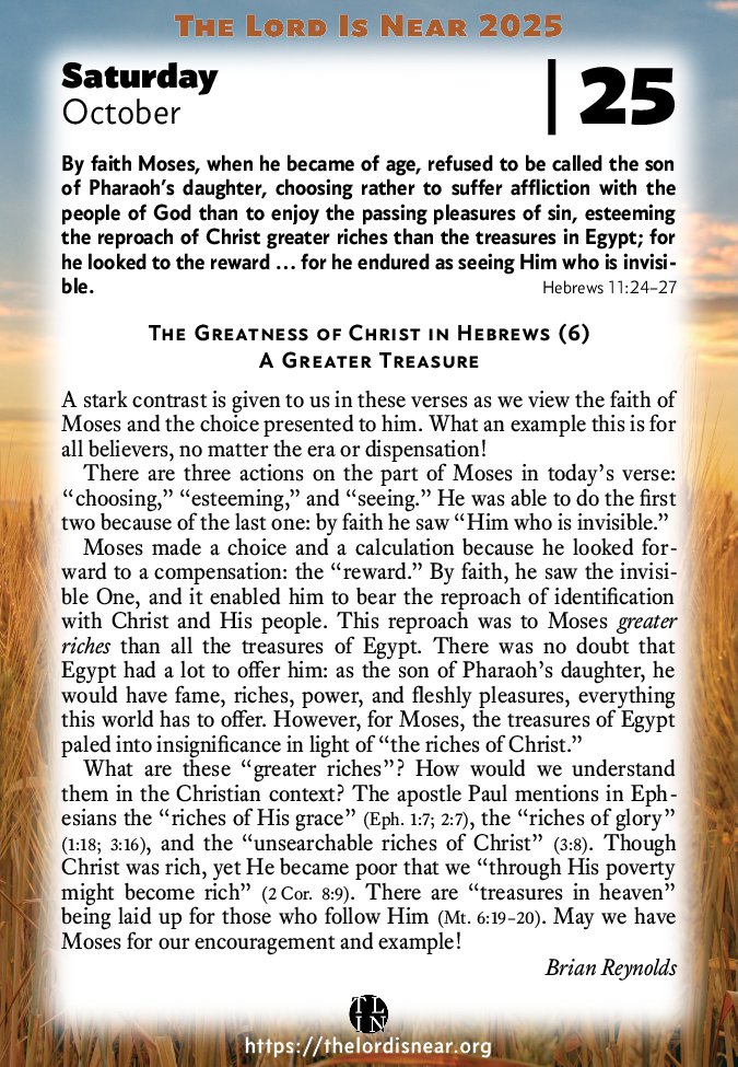 What are these “greater riches”? How would we understand them in the Christian context? The apostle Paul mentions in Ephesians the “riches of His grace” (Eph. 1:7; 2:7), the “riches of glory” (1:18; 3:16), and the “unsearchable riches of Christ” (3:8). Though Christ was rich, yet He became poor that we “through His poverty might become rich” (2 Cor. 8:9). There are “treasures in heaven” being laid up for those who follow Him (Mt. 6:19–20). May we have Moses for our encouragement and example!