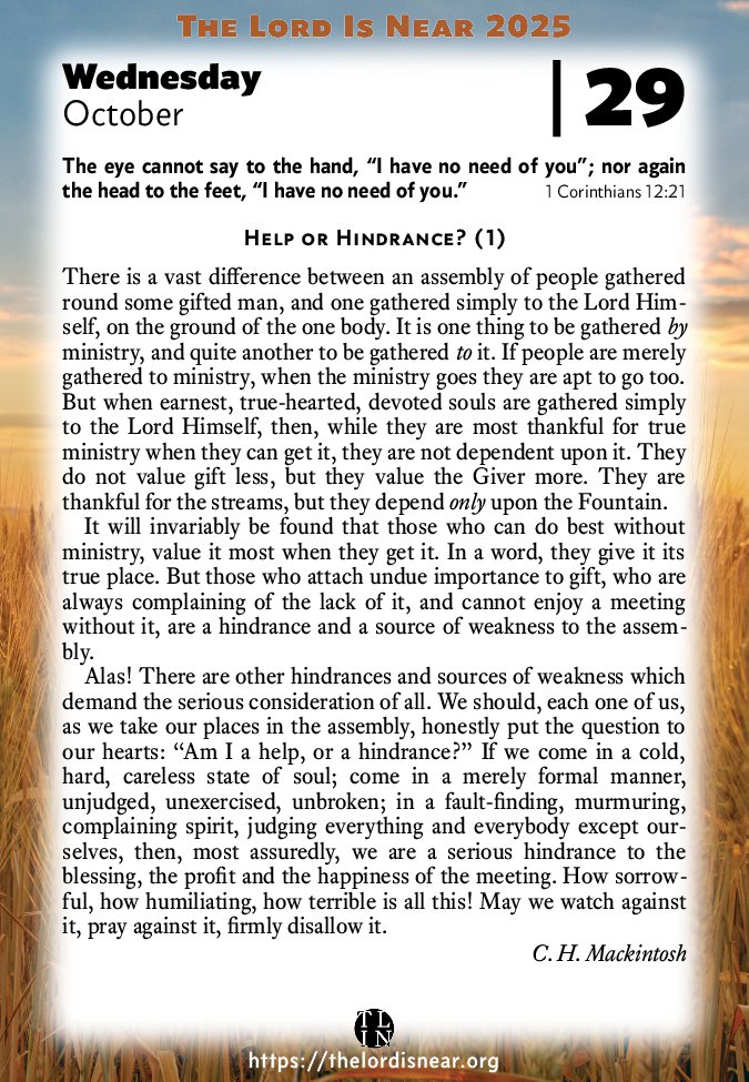 Alas! There are other hindrances and sources of weakness which demand the serious consideration of all. We should, each one of us, as we take our places in the assembly, honestly put the question to our hearts: “Am I a help, or a hindrance?” If we come in a cold, hard, careless state of soul; come in a merely formal manner, unjudged, unexercised, unbroken; in a fault-finding, murmuring, complaining spirit, judging everything and everybody except ourselves, then, most assuredly, we are a serious hindrance to the blessing, the profit and the happiness of the meeting. How sorrowful, how humiliating, how terrible is all this! May we watch against it, pray against it, firmly disallow it.