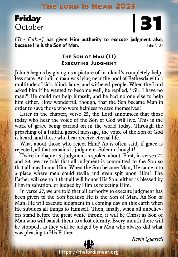 In verse 27, we are told that all authority to execute judgment has been given to the Son because He is the Son of Man. As Son of Man, He will execute judgment in a coming day on this earth when He subdues all things to Himself. Then, finally, when all unbelievers stand before the great white throne, it will be Christ as Son of Man who will banish them to a lost eternity. Every mouth there will be stopped, as they will be judged by a Man who always did what was pleasing to His Father.