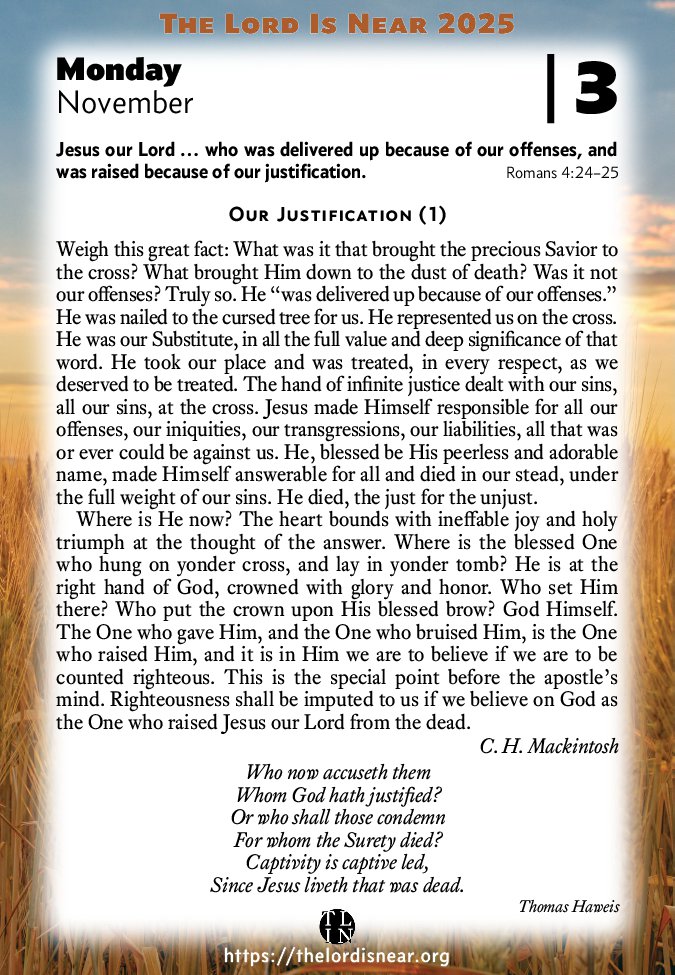 Weigh this great fact: What was it that brought the precious Savior to the cross? What brought Him down to the dust of death? Was it not our offenses? Truly so. He “was delivered up because of our offenses.” He was nailed to the cursed tree for us. He represented us on the cross. He was our Substitute, in all the full value and deep significance of that word. He took our place and was treated, in every respect, as we deserved to be treated. The hand of infinite justice dealt with our sins, all our sins, at the cross. Jesus made Himself responsible for all our offenses, our iniquities, our transgressions, our liabilities, all that was or ever could be against us. He, blessed be His peerless and adorable name, made Himself answerable for all and died in our stead, under the full weight of our sins. He died, the just for the unjust.