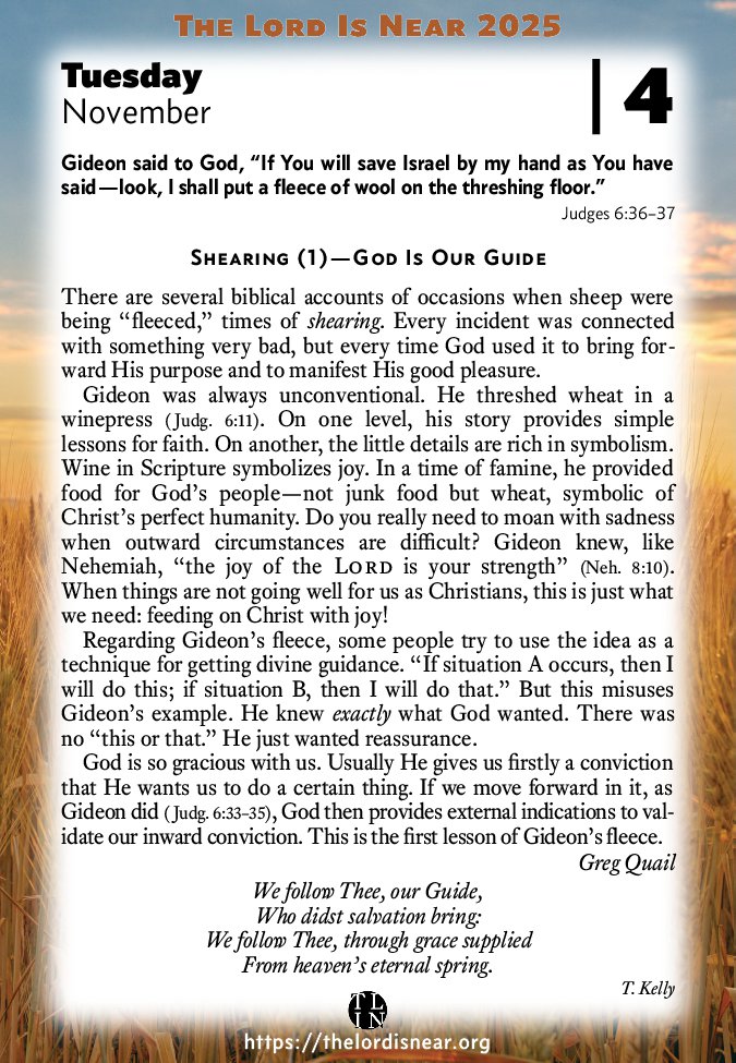 Gideon was always unconventional. He threshed wheat in a winepress (Judg. 6:11). On one level, his story provides simple lessons for faith. On another, the little details are rich in symbolism. Wine in Scripture symbolizes joy. In a time of famine, he provided food for God’s people—not junk food but wheat, symbolic of Christ’s perfect humanity. Do you really need to moan with sadness when outward circumstances are difficult? Gideon knew, like Nehemiah, “the joy of the Lord is your strength” (Neh. 8:10). When things are not going well for us as Christians, this is just what we need: feeding on Christ with joy!