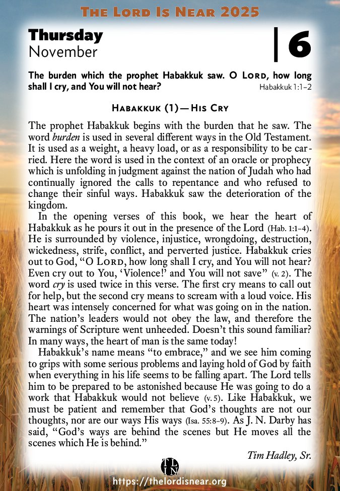 Habakkuk’s name means “to embrace,” and we see him coming to grips with some serious problems and laying hold of God by faith when everything in his life seems to be falling apart. The Lord tells him to be prepared to be astonished because He was going to do a work that Habakkuk would not believe (v. 5). Like Habakkuk, we must be patient and remember that God’s thoughts are not our thoughts, nor are our ways His ways (Isa. 55:8–9). As J. N. Darby has said, “God’s ways are behind the scenes but He moves all the scenes which He is behind.”