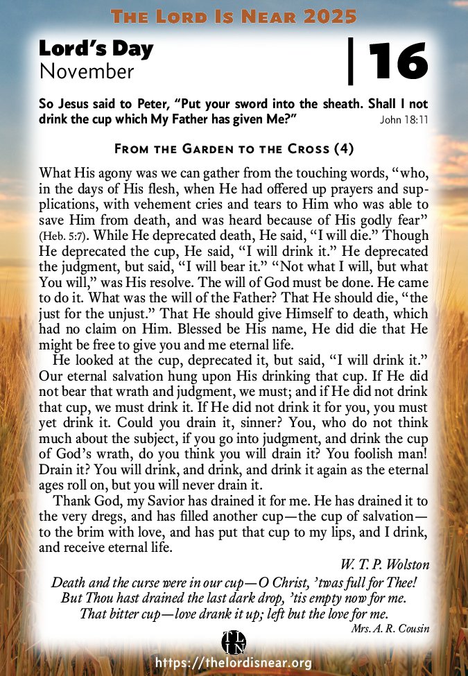 Thank God, my Savior has drained it for me. He has drained it to the very dregs, and has filled another cup—the cup of salvation—to the brim with love, and has put that cup to my lips, and I drink, and receive eternal life.