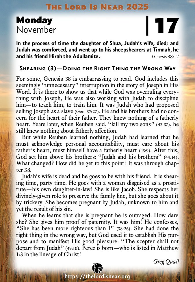 When he learns that she is pregnant he is outraged. How dare she? She gives him proof of paternity. It was him! He confesses, “She has been more righteous than I” (38:26). She had done the right thing in the wrong way, but God used it to establish His purpose and to manifest His good pleasure: “The scepter shall not depart from Judah” (49:10). Perez is born—who is listed in Matthew 1:3 in the lineage of Christ!