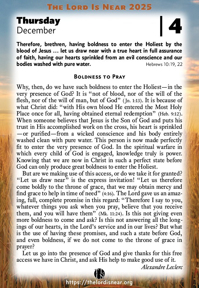 But are we making use of this access, or do we take it for granted? “Let us draw near” is the express invitation! “Let us therefore come boldly to the throne of grace, that we may obtain mercy and find grace to help in time of need” (4:16). The Lord gave us an amazing, full, complete promise in this regard: “Therefore I say to you, whatever things you ask when you pray, believe that you receive them, and you will have them” (Mk. 11:24). Is this not giving even more boldness to come and ask? Is this not answering all the longings of our hearts, in the Lord’s service and in our lives? But what is the use of having these promises, and such a state before God, and even boldness, if we do not come to the throne of grace in prayer?
