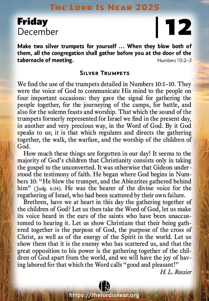 We find the use of the trumpets detailed in Numbers 10:1–10. They were the voice of God to communicate His mind to the people on four important occasions: they gave the signal for gathering the people together, for the journeying of the camps, for battle, and also for the solemn feasts and worship. That which the sound of the trumpets formerly represented for Israel we find in the present day, in another and very precious way, in the Word of God. By it God speaks to us; it is that which regulates and directs the gathering together, the walk, the warfare, and the worship of the children of God.