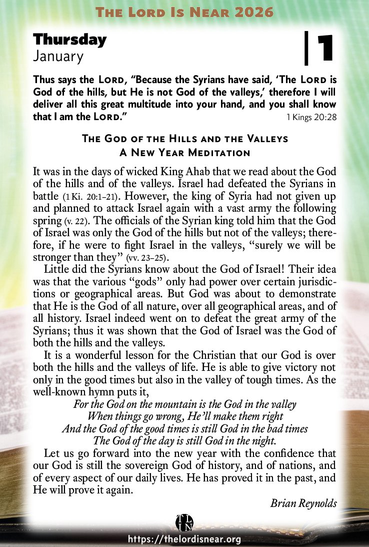 Little did the Syrians know about the God of Israel! Their idea was that the various “gods” only had power over certain jurisdictions or geographical areas. But God was about to demonstrate that He is the God of all nature, over all geographical areas, and of all history. Israel indeed went on to defeat the great army of the Syrians; thus it was shown that the God of Israel was the God of both the hills and the valleys.
