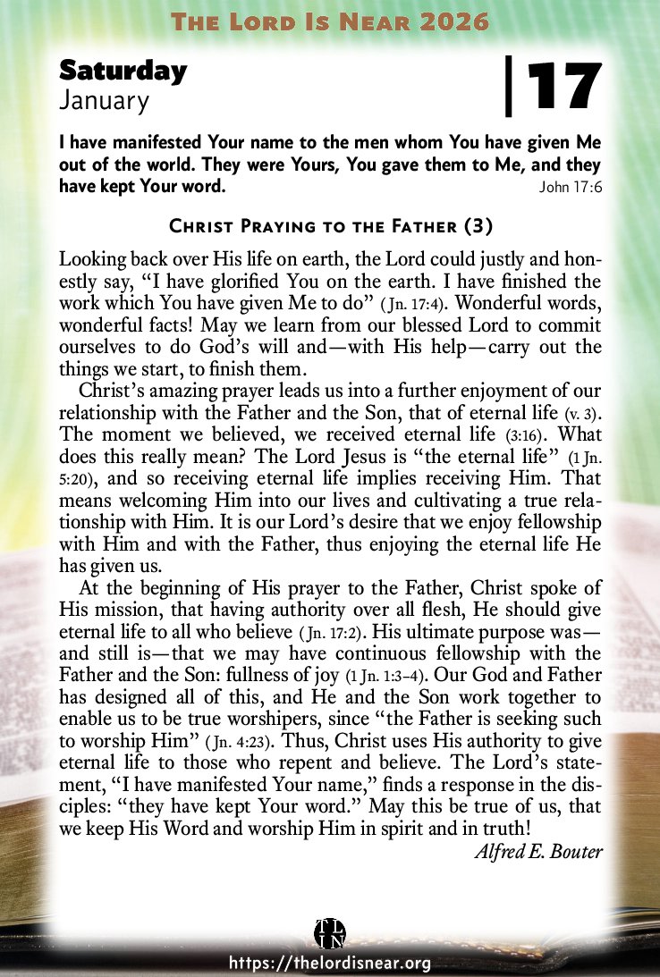 At the beginning of His prayer to the Father, Christ spoke of His mission, that having authority over all flesh, He should give eternal life to all who believe (Jn. 17:2). His ultimate purpose was—and still is—that we may have continuous fellowship with the Father and the Son: fullness of joy (1 Jn. 1:3–4). Our God and Father has designed all of this, and He and the Son work together to enable us to be true worshipers, since “the Father is seeking such to worship Him” (Jn. 4:23). Thus, Christ uses His authority to give eternal life to those who repent and believe. The Lord’s statement, “I have manifested Your name,” finds a response in the disciples: “they have kept Your word.” May this be true of us, that we keep His Word and worship Him in spirit and in truth!